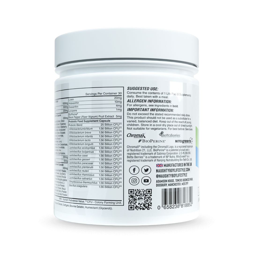 Life Pac contains over 80 active ingredients including patented ingredients MitoGreens®, BettaBerries®, ChromaX® and lastly BioPerine® for maximum absorption